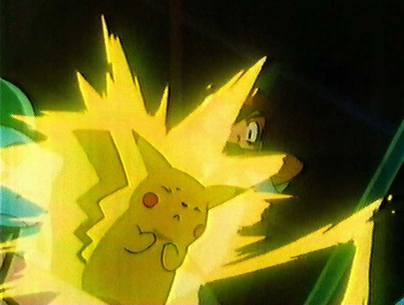L’episodio è il 38° della prima serie. Per una serie di ragioni che non vi sto a spiegare i protagonisti si trovano nel cyberspazio a combattere contro il Team Rocket (i cattivi). Per proteggere i suoi amici, Pikachu (Pikachu è il pokemon giallo, quello famoso, e se non lo conoscete vergognatevi), spara il suo fulmine contro i missili del Team Rocket (il Team Rocket aveva dei missili). Questa scena, questa esplosione di forze elettriche e di spettri elettromagnetici è stata resa dagli animatori con l’intermittenza ad altissima frequenza dei colori rosso, blu e azzurro.