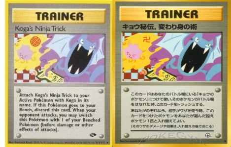 Nel 1996 esce il gioco di carte dei Pokemon. Migliaia di carte sempre nuove e collezionabili. Sull’immagine della carta Koga’s Ninja Trick appare una svastica. Ora voi capirete che, alla luce di quello che ho scritto prima, un chiunque che vede una svastica sulla carta dei Pokemon non dice: «Ah vedi, questo prodotto dell’industria ludica giapponese ripropone l’antico simbolo sanscrito del sole, una in senso antiorario ancora oggi usata da molti templi buddisti», ma dice:«NAZISMOOOOOOOOOOOOOO!!». Lo posso anche capire. Per la versione europea la svastica è stata camuffata con un ghirigoro orientaleggiante.