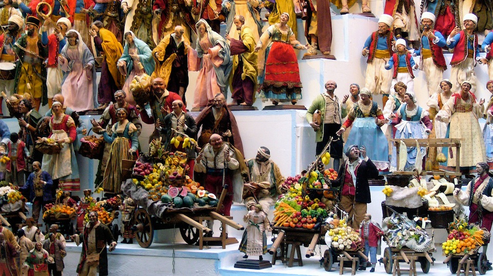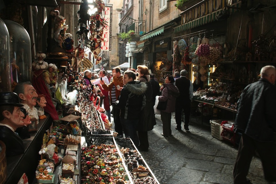 Normalmente, un banale 5 Febbraio, passereste per la via mediamente frequentata, angusta, circondata di palazzi alti e grondanti biancheria ad asciugare. Ai lati, una densità di banchetti e bancarelle proibita dalle leggi della fisica, carichi di statuette del presepio di ogni forma e dimensione, anacronistiche o meno, accessibili alle tasche dei turisti od eccessive per lo Sceicco dell’Oman. Uno spettacolo folkloristico, sì.