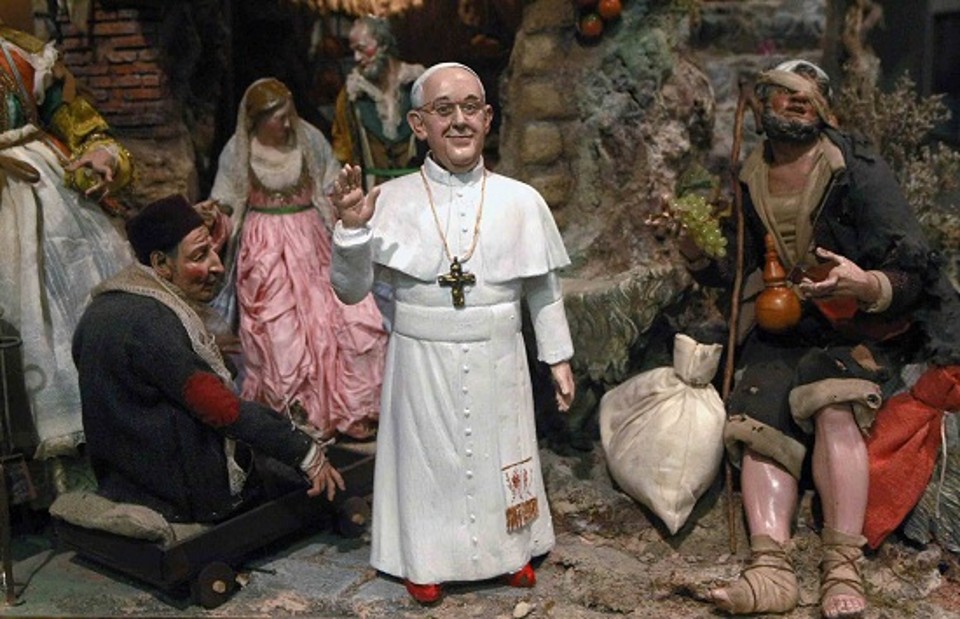 In disparte, una statuetta di Papa Francesco (fatta riciclando vecchi modelli di Vianello con aggiunta di una tunica bianca) si fa grasse risate e prende appunti su un piccolo taccuino di ceramica, mentre nel cielo, illuminato a giorno da stelle di led, un dio lontano non osserva i suoi figli, ma sembra molto impegnato a decantarne le doti a strani e lontani passanti.