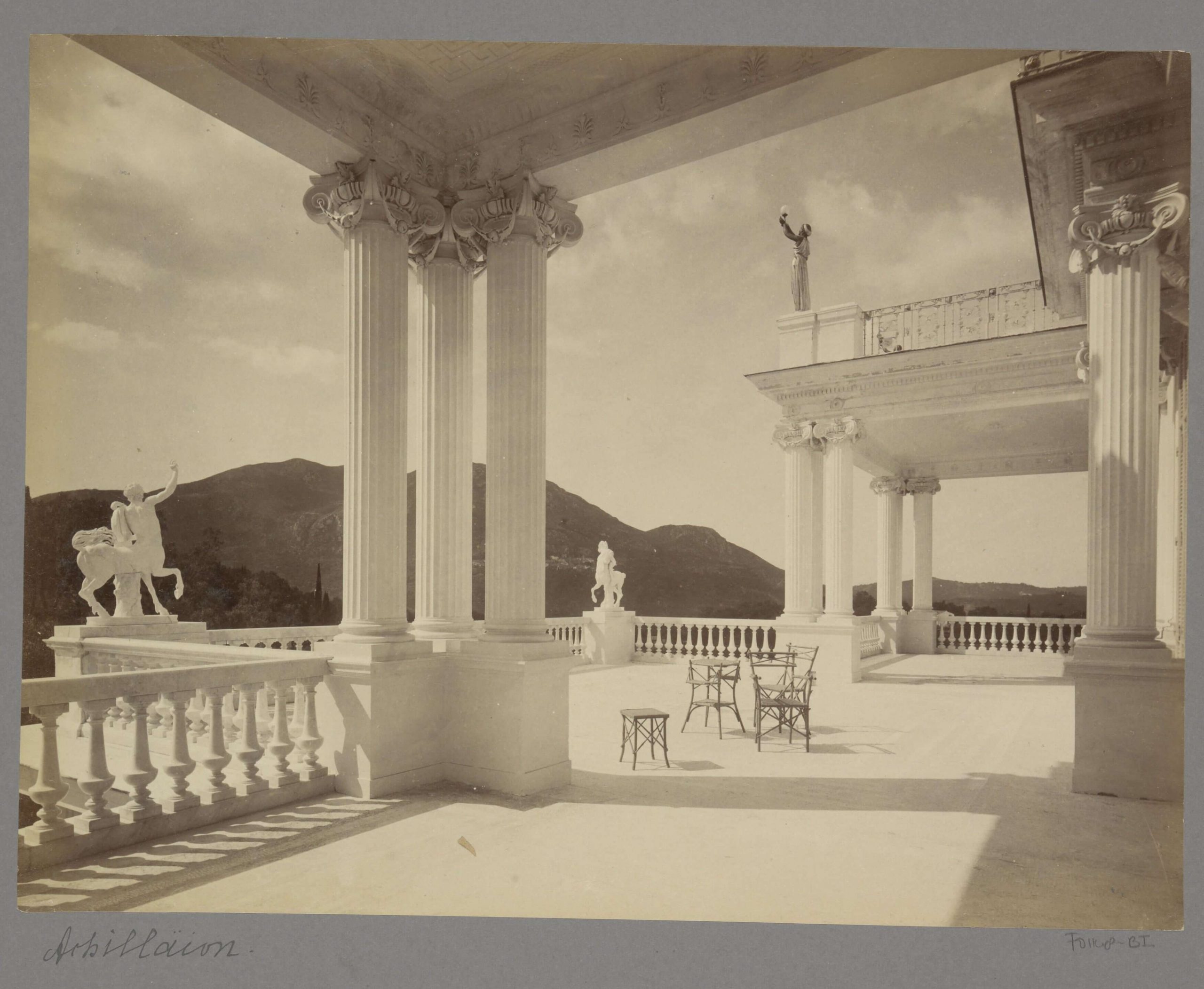 5. Terrazza dell’Achilleion a Corfù con tavoli, sedie, colonne e statue di centauri, anonimo, 1895 ca. — Fonte