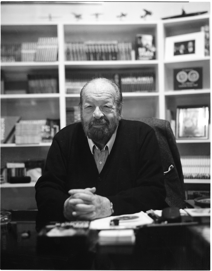«Nelly! Il vizio!» la voce tonante di Bud riempie la stanza. Nelly si alza di scatto, afferra il pacchetto di sigarette e le porta a Bud. Ci guardiamo attorno: dallo spiraglio della porta che dà nell’ufficio di Bud si intravedono tre poltrone di pelle bianca e una tastiera professionale che copre la visuale su una libreria piena di libri, dvd edizione speciale dei suoi film e tanti modellini d’aeroplani. La signora Nelly lavora con Bud da più di quarantadue anni, praticamente metà della vita del nostro eroe. Quarantadue anni che si palesano in piccole contrazioni facciali quando parla degli avversari di Bud in vasca, il suo matrimonio, i suoi successi. Appena ci sediamo ci racconta immediatamente un aneddoto magnifico: quando Bud arrivò a Hong Kong venne travolto da una folla di soldati americani attraccati con la loro portaerei. A bordo avevano la videocassetta di Trinità, un film che avevano visto e rivisto un milione di volte. Per loro era un eroe, quindi poté fare tutto ciò che un comune civile non avrebbe potuto fare: gli permisero di salire su un caccia, ma con la sua stazza non riuscì a chiudersi dentro l’aereo. Ridiamo. «Falli entrare» sentiamo da fuori.