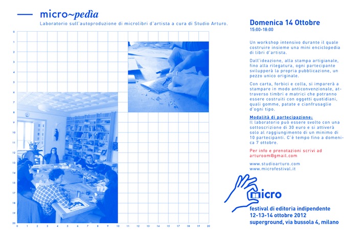 Immagino vi ricorderete del nostro Santo della micro-editoria, dopo qualche mese quel Gutenberg tanto caro alla carta e all’inchiostro ha deciso di tornare per farvi conoscere Micro, il festival di editoria indipendente che si terrà a Milano allo spazio Superground dal 12 al 14 ottobre prossimi. Marco Nicotra, fondatore della casa editrice milanese Bolo Paper e Giuliana Tammaro, sua “socia” e curatrice della webzine Branchie, menti de La Caffettiera, sono gli organizzatori di Micro e i nostri brillanti interlocutori. Prima di lasciarvi all’intervista, non posso che lasciarvi una collezione di link degli espositori presenti al festival e augurarmi di riuscire a salire nella città della Bela Madunina. 0-100 (IT), Aalphabet (IT), AKV Berlin (DE), BOLO Paper (IT), Canicola (IT), Celeste (IT), Cesura Publish (IT), Delebile (IT), Emidio Bernardone (IT), Eric Winkler (DE), Gloria Glitzer (DE), Lök (IT), Nurant (IT), Mekanik Copulaire (FR), Print about me (IT), Solo ma non troppo (FR), Spheres (CH), Strane Dizioni (IT), Talkinass (IT), TBooks Cologne (DE), Topipittori (IT), Troglodita Tribe (IT), Zweizehn (DE). Per prima cosa, una curiosità su di voi: come vi siete avvicinati al mondo dell’editoria e dove avete trovato il vostro terreno fertile per sviluppare tale passione? È stato un processo lento e graduale. Io e Marco veniamo da due città diverse e da diverse esperienze, ma entrambi abbiamo da sempre una forte spinta a produrre progetti indipendenti (e autofinanziati). Branchie e BOLO Paper ne sono la dimostrazione: il primo è una piattaforma articolata (blog + archivio di spazi espositivi + casa editrice) per promuovere e parlare del sottobosco culturale italiano; il secondo, una casa editrice con all’attivo più di venti titoli diversi distribuiti in Italia e all’estero. In modo naturale l’editoria è entrata nelle nostre vite, unendo da ormai un intenso anno il nostro percorso. Il terreno in realtà l’abbiamo reso fertile noi! Nel senso che, come detto sopra, tutto quello che facciamo è autoprodotto. In più siamo molto curiosi e per questo abbiamo da sempre osservato il lavoro degli altri e assorbito gli aspetti positivi. La nostra fortuna è stata poi quella di trovarci in contesti vivi (Venezia e Milano, ora per entrambi Milano), in cui poter relazionarci e imparare. Alla mia vista, voi siete dei supereroi dell’editoria. Da cosa nasce la volontà di un festival interamente dedicato alla micro-editoria? Beh definirci eroi forse è un po’ troppo, ma ti ringraziamo! L’idea è nata perché amiamo la carta stampata ed era un nostro forte desiderio portare a Milano, città in cui abitiamo, alcuni esempi di eccellenza nazionale ed internazionale in questo ambito. Abbiamo infatti notato che, in controtendenza al generale aumento d’interesse verso la microeditoria, in questa città ancora nessuno aveva organizzato un evento così strutturato e complesso incentrato sul tipo di publishing di cui ci interessiamo, ovvero quello dedicato al graphic design, all’illustrazione e alla fotografia. MICRO è alla sua prima edizione ed è un festival pensato come format slegato dalla location di quest’anno, che tra l’altro riteniamo sia davvero affascinante: un’ex mensa dell’ANSA di 600 mq data in gestione dal Comune di Milano all’associazione culturale ArtKitchen (con cui stiamo co-producendo il festival) e che si trova in via D. Bussola 4, vicino alla fermata della metro Romolo. Micro, ha integrata nel suo payoff la parola independent. Quali caratteristiche deve avere per voi l’editoria contemporanea per essere definita tale? In un momento storico in cui la logica del maker si sostituisce a quella dello user, le persone si auto-creano le opportunità spinte dai propri interessi e passioni, in questo specifico caso, l’editoria. L’editoria di cui ci occupiamo è quella dei publisher che, come noi, seguono la filiera produttiva dall’input creativo alla produzione e al confezionamento, fino alla distribuzione. La vostra lista di espositori è molto nutrita e gustosa, ma ci saranno delle preferenze personali, una micro-casa editrice di maggior ispirazione per ognuno di voi. Parlate adesso o tacete per sempre! Stimiamo con sincerità il lavoro di tutti gli editori che saranno a MICRO, per questo non riusciamo a rispondere a questa domanda. Ci dispiace! Venite a trovarci e capirete cosa intendiamo, oltre alla lista di espositori che leggete sopra, ci sarà anche un tavolo collettivo con centinaia di altre edizioni! Micro è principalmente concentrato sulla carta stampata, come vedete il mondo del digital publishing? E quale futuro lo aspetta? Sì, a MICRO si parlerà esclusivamente di pubblicazioni su carta stampata. Un paio dei tanti motivi di questa scelta: perché abbiamo preferito accendere i riflettori sul lavoro di tutti quei publisher che, pur di andare in stampa, producono grandi sforzi e sacrifici. Perché focalizzare su un’unica tematica riteniamo sia la strategia migliore per dare forza all’evento stesso. Crediamo il futuro del digital publishing sia roseo! Ormai chi non è in possesso di un tablet?! Auspichiamo questa prospettiva perché vedere sprecata la carta nella stampa di alcune – in realtà molte – pubblicazioni è per noi una questione importante. Se poi pensiamo ai soldi che vengono impiegati per la produzione, da finanziatori – con tutte le difficoltà del caso – dei nostri progetti, ci sentiamo male! La carta, a nostro parere, dovrebbe essere utilizzata unicamente nel caso in cui non sia solo un modo come un altro per diffondere dei contenuti, ma diventi una componente essenziale per conferire valore estetico ed esperenziale all’oggetto-pubblicazione. Quindi non resta che dire: vi aspettiamo il 12-13-14 ottobre a MICRO – festival di editoria indipendente!
